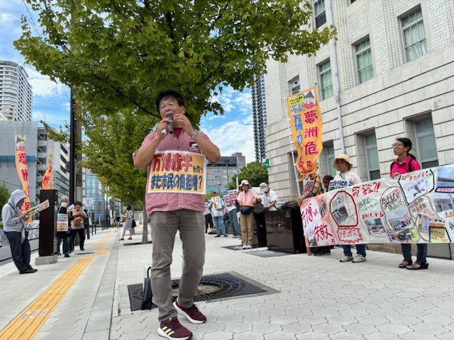 府民の会・山川よしやす事務局長の行動趣旨説明の後、共産党石川たえ議員、立憲民主党野々上愛議員より連帯あいさつ。「大阪関西万博は失敗ダ!!」の当日配布チラシを作った府民の会メンバーがその両面に書かれた万博の問題点をひとつひとつ読み上げ共有した。