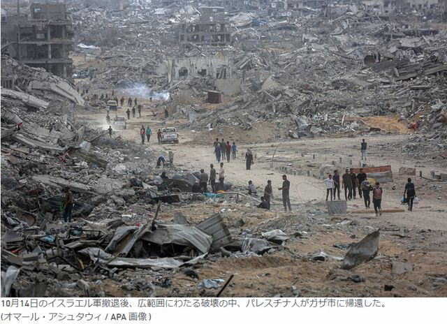 一方、イスラエル軍は停戦後も、少なくとも70人以上のパレスチナ人を殺害している(10/19)。停戦違反は明らかだ。また人質の遺体1体に対し、パレスチナ人被拘禁者の遺体15体の比率で返還することになっているが、まだ135体にとどまっている(10/18現在)。しかも、身元情報を提供しなかった。首にロープを巻かれ後ろ手に縛られたままの遺体、拷問の痕が残る遺体が多くあった。