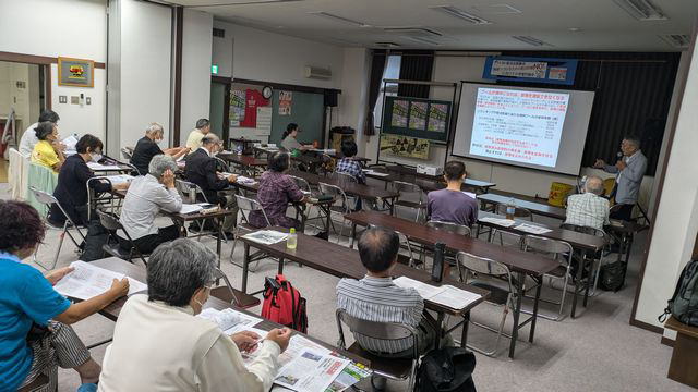 4日の学習会には約20人が集いました。木原さんが100ページを超える資料スライドを駆使、「原発は、現代科学で制御できず、人類の手に負えない」「六ケ所村の工程と危険性」「次世代原発〜革新軽水炉、小型モジュール炉、核融合炉について〜」など1時間半多岐にわたり学習しました。
