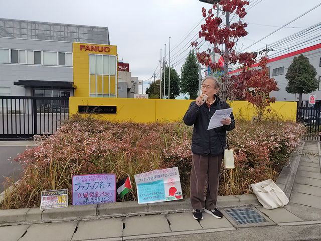 私たちは「ファナックはイスラエルに協力するな」と看板を広げ、入口からマイクで「訪問予定をお伝えしていたZENKOです。