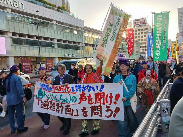 15日の新宿アクションには280人が参加。楚南さんは「このまま中国に挑発的な態度を続け、集団的自衛権だと台湾の問題に自衛隊を突入させたら、宮古島は戦場にされる。そういう不安の中に島じまがあることを知ってほしい」と呼びかける。行き交う人びとに向けて「平和に生きたい」「ここで暮らしたい」「島のことは島の人(しまんちゅ)が決める」とコールを重ねた。