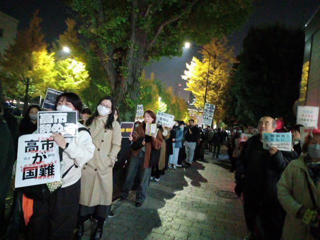 高市首相の台湾有事を巡る「存立危機事態」発言の撤回を求めて11月21日、「WE WANT OUR FUTURE」が呼びかけた緊急抗議行動が行われた。首相官邸前に1700人が集結し、若者がマイクを握り「戦争あおるな」「平和守れ」とコール。