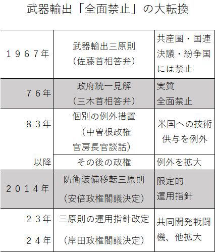 第2次安倍政権はほぼ全面禁止(1983年以後例外が拡大)だった「武器輸出三原則」を「防衛装備移転三原則」と言い換え、「禁止原則」を大転換した。高市政権は、この時の限定5類型(救難・輸送・警戒・監視・掃海)の制約を撤廃し、全面解禁をめざす。