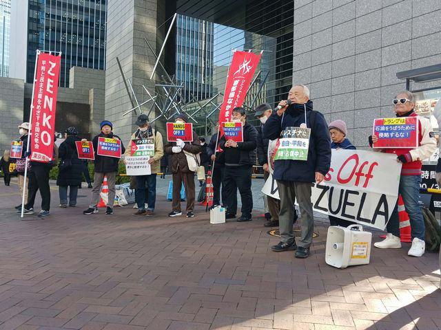 イスラエル大使館に向けて、「フリーフリーパレスチナ」連呼。代表者5人が大使館前まで行き、停戦を破り攻撃を続けるイスラエルに「殺すな」と声を枯らして繰り返し叫ぶ。パレスチナでの人権侵害停止を求める要請書を門扉に挟んだ。アメリカ大使館では、ベネズエラ侵略のトランプ大統領を糾弾。ガザ和平計画の名で支配を狙う「平和評議会」の撤回を訴えた。