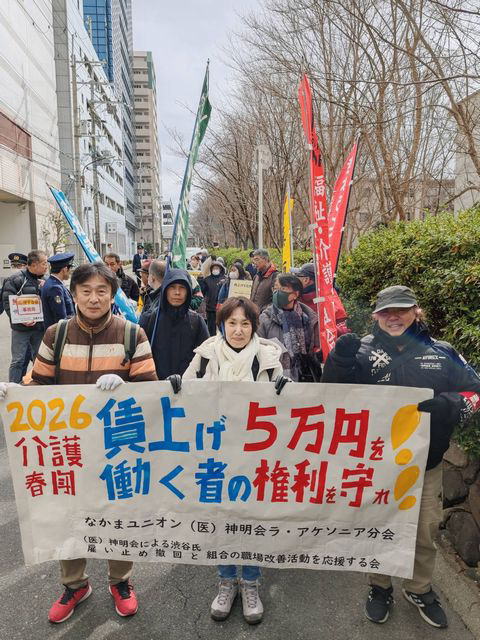 1月31日大阪・箕面(みのお)市内で、「(医)神明会による渋谷氏雇止め撤回と組合の職場改善活動を応援する会」(応援する会)とラ・アケソニア分会の共催による「介護春闘 賃上げ5万円!働く者の権利を守れ!」集会とデモ行進を行いました。小雪舞う厳寒の中、40名を超える仲間の熱気で寒さを吹き飛ばしました。