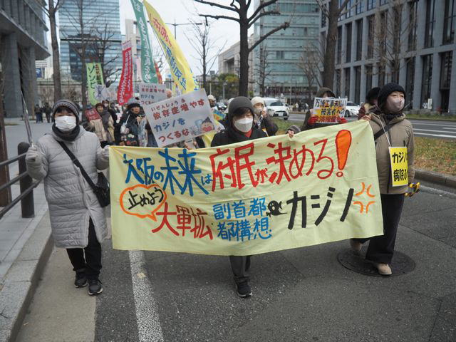総選挙と大阪ダブル選挙投開票の前日2月7日、大阪市で「維新府市政の都構想・カジノNO!大阪の未来は府民が決める!止めよう!大軍拡・副首都・都構想・カジノ 御堂筋パレード」が行われ50人が参加。主催は平和と民主主義をともにつくる会・大阪、ZENKO(平和と民主主義をめざす全国交歓会)が共催し、夢洲カジノを止める大阪府民の会)も賛同した。