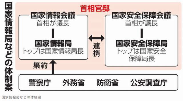 「情報」収集にあたる現行組織は、内閣情報調査室、外務省(国際情報統括官組織)、防衛省(情報本部)、警察庁(警備局)、法務省(公安調査庁)などがある。このうち内閣情報調査室を局に格上げし、「国家情報局」として各省庁の情報を一元的に管理する。しかも国家安全保障局と同格となり、国家情報会議(議長首相)の事務局を担う。国家情報会議は、安全保障会議が「武力攻撃事態」や「存立危機事態」の認定など軍事方針を決める際の根拠を揃えることになる。