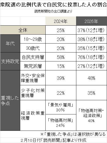 比例代表の投票先に自民党を挙げた人は37%に上り、中道改革連合の16%などを突き放した。自民が大敗した2024年の衆院選で自民に投票したと答えた人は若年層ほど少なかったが、今回は18〜29歳が38%と高かった(18ポイント増)。
