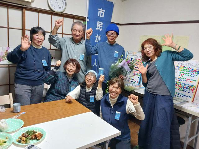 午後11時すぎ、開票率94%で「得票3000、上位当選確実」の連絡が入る。あるがさんは「目標が達成できた。日野の支援者のみなさんをはじめ日野以外からも応援に来ていただき、組織的な選挙が闘えたことがうれしい」と感謝を伝えた。「日野・市民自治の町をめざす会」の上地悦子さんは「日野市政を監視する“番人”に、という声をたくさんもらった。そういう議員が入ったことは本当に力強い」とエールを送る。