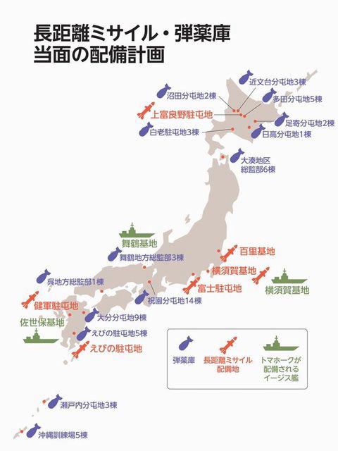 一方、長射程ミサイルの配備基地は明らかにした。陸上自衛隊の上富良野駐屯地(北海道)、富士駐屯地(静岡)、健軍駐屯地(熊本)、えびの駐屯地(宮崎)。12式地対艦誘導能力向上型(射程1000`b)が配備される。海上自衛隊では、米国製巡航ミサイル「トマホーク」(射程1600`b)を搭載するイージス艦の母港となる横須賀、舞鶴、呉、佐世保を公表している。