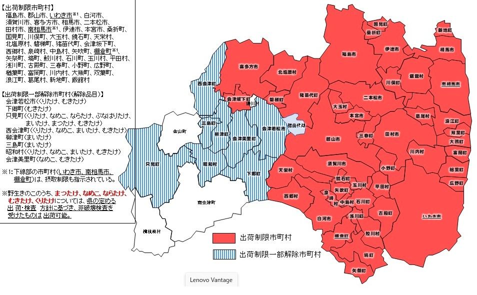 福島産のキノコ類は、25年段階でも出荷停止「水準」(100ベクレル)を超えるものが多く、特に北塩原村産のチチタケからは790ベクレルという高い汚染のものも出た。25年9月現在、福島県内55市町村で野生キノコ類の出荷が制限され、福島県の面積の半分以上に及ぶ(図)。