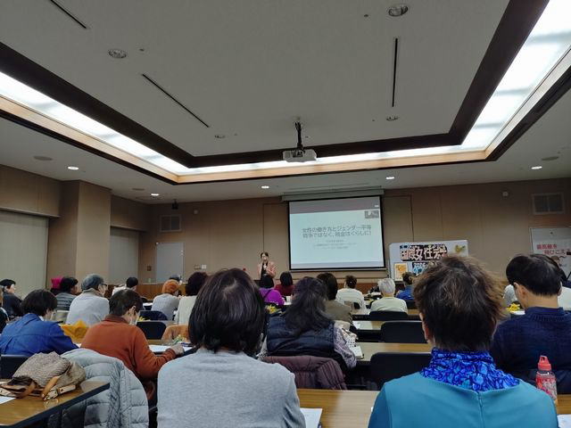 人手不足対応策の「女性活躍」で活躍に不可欠な人権保障は語られない。女性の賃金は最低賃金の引き上げで上昇傾向だが、平均賃金でみると非正規女性は正社員男性の半分程度。「よくなった」という目くらましの裏に差別があることを指摘した。