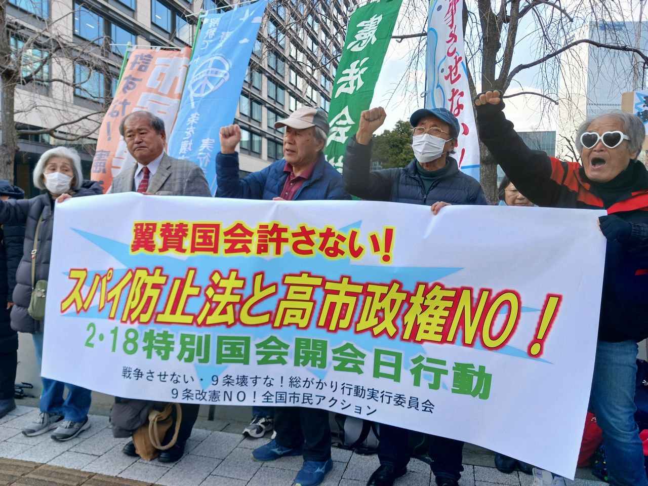市民らが「スパイ防止法と高市政権NO」と声を上げた。