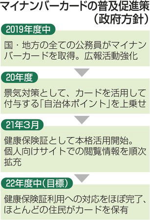 政府は、都道府県と市町村に対して2つの総務省通知(6/28)を発し、主に5点を指示。(1)公務員の健康保険機関である共済組合員(正職員)及びその扶養者に対して、事前に氏名等印字した申請書を配布し20年3月までに取得勧奨(2)20年4月新規採用予定者に対する入庁前取得勧奨(3)共済組合員でない非常勤職員への取得勧奨(4)総務省から各自治体に対するカード取得状況の照会(6月、12月、3月)及び所属部署でも状況を把握し未申請者に適宜勧奨(5)職員がすべての来庁者に対してカードの申請勧奨及び申請窓口への誘導を実施する―というものだ。