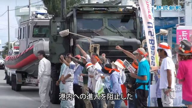 17日午前7時前、「オープンウォーターセーフティーボート」と呼ばれる大型の救助用ゴムボートをけん引した米軍車両が本部港に姿を現わすと、かけつけた市民らは車両の前に立ちはだかり、「米軍の港使用反対」とプラカードを掲げ座り込みで港内への搬入を阻止した。