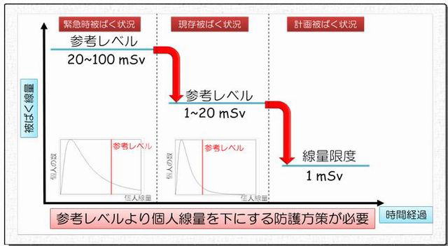 その具体化がICRP2007年勧告であり、それまでの計画被ばく状況(平時)に新たに緊急時被ばく状況と現存被ばく状況を追加し、それぞれの参考レベル線量(前者は年20〜100_シーベルト、後者は年1〜20_シーベルト)を提起した。緊急事態が起こった場合は、公衆の被ばく限度は適用されないというのだ。