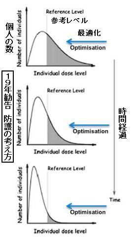 改訂案では、緊急時の参考レベルは「一般に年100_シーベルトを超えるべきではない」とされる。放射能放出事故が起こっても、その地域が年100_シーベルトを超えなければ、住民を避難させる必要はないと受けとれる。しかも、参考レベルは上限値ではないので、当初はその数値を超える被ばくをする人が半数くらいいても構わないのだ。改訂案に掲載された図には、単位も参考レベルの表示もないが、右側の網掛け部分が参考レベルを超える被ばくをする人で、それが徐々に減っていくことを示すと思われる。