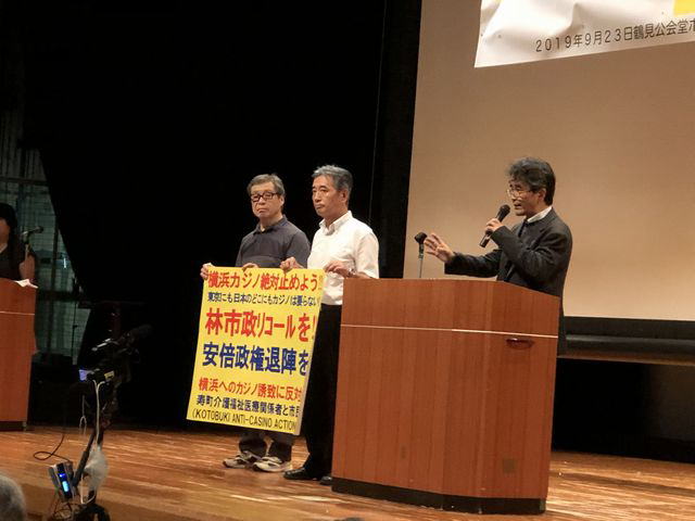 9月23日、鶴見区で「カジノ誘致反対市民集会」がもたれ、ともにつくる会は司会をつとめるなどスタッフとしても参加。約300人の参加がありました。現在、市民団体や政党などの間で、市長リコールか、住民投票条例制定か意見が分かれています。私たちは、リコールを主張して運動を盛り上げつつ、一致した方向を探っています。集会では、静岡大の鳥畑与一教授が海外の例もあげてカジノでは地域が活性化しない根拠を詳しく述べられ、力をもらいました。