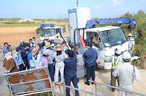 沖縄島から駆け付けた山城博治さん(沖縄平和運動センター議長)は「参院議員も来ているのに、(沖縄防衛局が)始めさせてもらいます、としか言わないのはおかしいだろう」と怒り心頭だ。