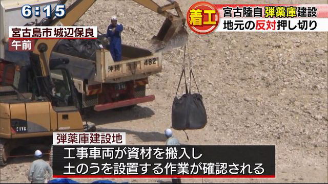 10月7日早朝6時半、宮古島市城辺(ぐすくべ)の保良(ぼら)鉱山に陸上自衛隊の弾薬庫を建設するための工事を着工した。隣接する保良と七又(ななまた)の両部落会は、「弾薬庫建設反対」の決議をあげている。3日に沖縄防衛局は住民説明会を開催したが、「弾薬庫」のことを明示しないまま開こうとしたため約100人が出席を拒否し、参加した住民は約10人だけだった。防衛局は着工と明確に言わないまま、その4日後不意打ちのように強行した。