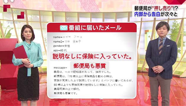 「高齢の母が郵便局員に保険を押し売りされた」。取材のきっかけは視聴者からのメールだった。情報提供を呼びかけたところ、現役職員や元職員から驚きの証言が集まった。「ノルマに追い詰められ、お客様を詐欺まがいで契約させるパターンはしょっちゅうみます」「高齢者の場合、だましやすい」等々。
