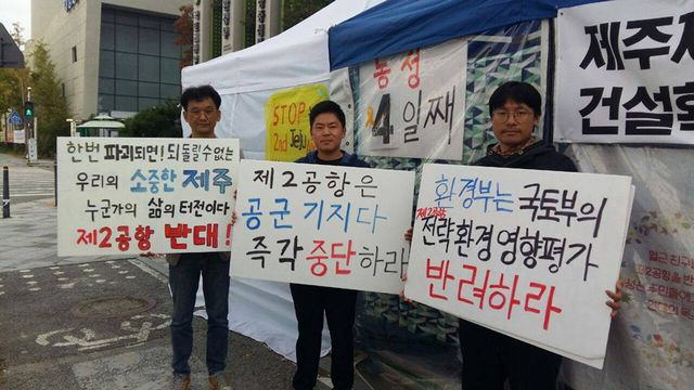 韓国・済州(チェジュ)島で、新たな軍事空港の狙いを持つ第2空港建設への動きが緊迫の度を増している。空港建設を所管する国土部(日本の国土交通省にあたる)が建設の前提となる環境アセスメント「戦略環境影響評価書」を環境部(環境省にあたる)に提出し、第2空港に反対する人びとはただちに撤回と建設反対の声を上げた。11・4団結まつり(大阪)、12月ZENKO(平和と民主主義をめざす全国交歓会)スピーキングツアーに参加する済州島の反基地活動家ノ・ミンギュさんは10月18日、韓国中部・世宗(セジョン)市の環境部庁舎前で「環境部長官は面会に応じろ、戦略環境影響評価を返上せよ、葛藤(紛争)調停協議会を構成せよ、済州第2空港反対」と無期限断食闘争に突入。日本からの連帯が求められている。記者会見発表文(要旨)を紹介する。