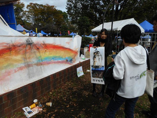 ステージの後ろでは、画家の山内若菜さんによるライブペインティング「韓日友好フリーハグ 虹をかけよう」。ムクゲやレンギョウなど韓国の花の絵を和紙に貼り、ハグする二人を包む友好の虹をつくる。「人と人とが寄り添い合って希望が生まれる。つらいこと、被害にあったことだけでなく、未来につながるものをみんなで描ければ」と若菜さん。七色の花が参加者の手で散りばめられていった。