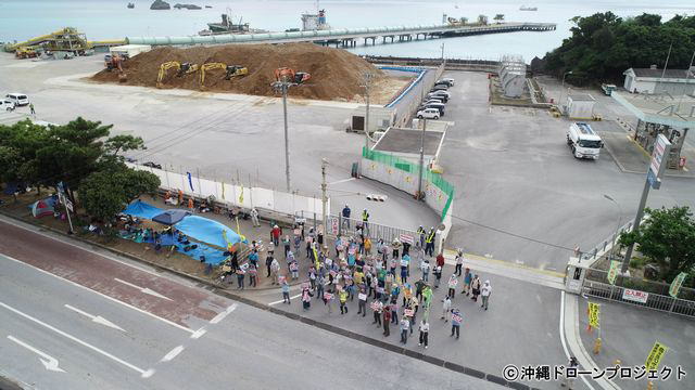桟橋構内には搬出用の赤土を含む土砂が大量に積み置きされ、土砂を運搬船に積み込む作業をするのが空ダンプカーだ。この空ダンプを桟橋構内に立ち入らせないために、桟橋入口への結集とダンプの対向車線を多くの車が安全速度で走ることで入構を阻むGoGoドライブ≠ェ呼びかけられた。ZENKOメンバーもこの大行動にかけつけた。
