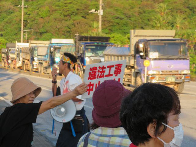 行動3日目の23日、午前5時半には市民が安和桟橋と本部町の塩川桟橋に分かれて待機し警戒した。午前7時、いよいよ空のダンプ8台が桟橋に入るため列をなしてやってきた。市民は約80人に増え桟橋の入口を完全に封鎖。ダンプは全く動けないまま、午前9時半には立ち去り勝利に。桟橋前は歓喜のスピーチと歌でわき上がった。