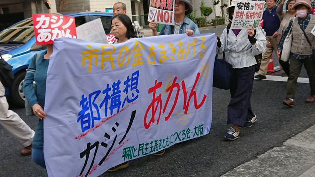 平和と民主主義をともにつくる会・大阪は「市民のカネをまきあげる都構想・カジノ あかん」の手作りバナーで参加。「カジノが狙う、その財布」「カジノより福祉にまわせ」とデモで市民に訴えた。