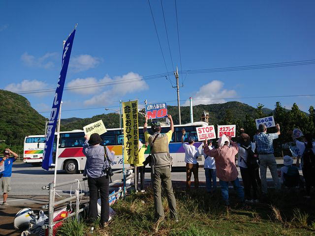 3日目は安和桟橋ゲート前で行き交う車にボードでアピール。グルグル回りながらのアピールデモで構内へ入るダンプを止める取り組みだ。