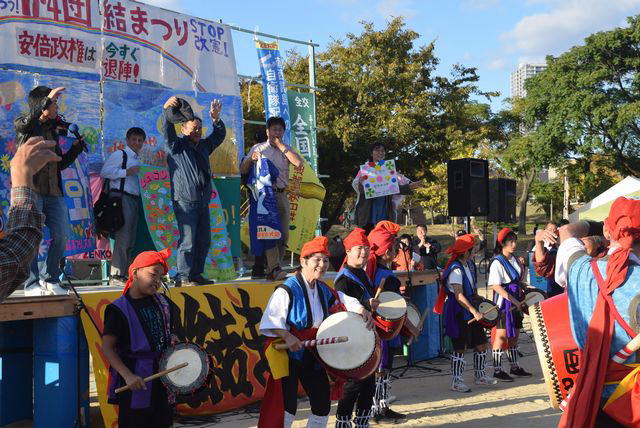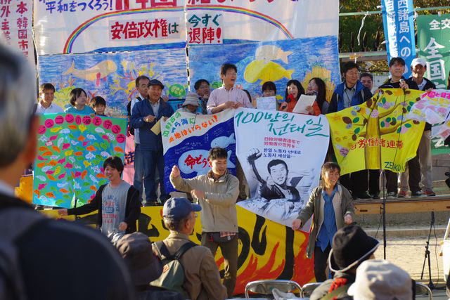 恒例の団結まつり。今年の意義についてZENKO共同代表田中拓真さんは「韓国、沖縄の闘いと連帯し、戦争・憲法改悪を進める安倍政権を退陣させること」と述べた。ステージでアピールした35の団体・個人は基地建設との闘いをはじめ、反原発、労働争議、教育差別との闘いなど分野は幅広いが、そろって安倍政権退陣を口にした。