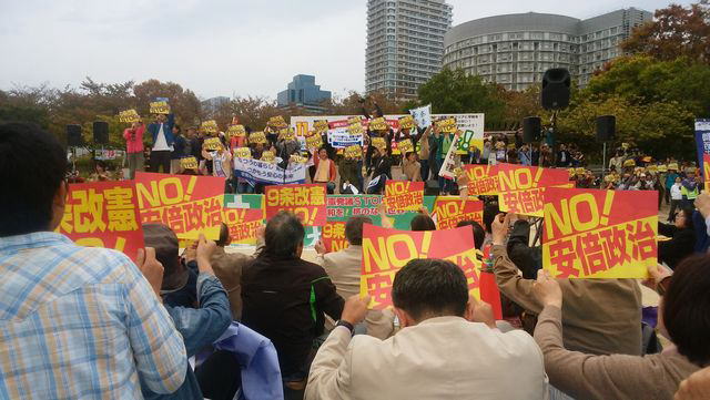 大阪でも、「輝け憲法!いかそう9条!11・3おおさか総がかり集会」が開かれ、1万2千人が韓国、沖縄市民とともに安倍退陣へ声を上げた。