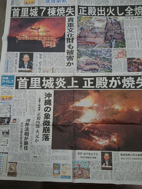 菅義偉官房長官は火災当日に「政府として全力で取り組む」と表明し、新聞では「辺野古新基地建設を巡る政治的対立は封印」(11/1沖縄タイムス)という表現まで表れた。玉城知事が辺野古新基地建設を容認することはあり得ないが、甚大な台風被害救済にもなかなか動かない政府がすぐに費用負担への協力を申し出るところなどどうも胡散(うさん)臭い。衛藤晟一沖縄担当相は11月5日の会見で「国の責任で再建」と述べた。