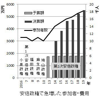 例えば今年19年。7月の参院選をにらみ、改選議員に招待枠があてがわれた。露骨な集票活動、支持固めだった。18年は自民党の地方議員が大量に招待されている。発送された招待状は今年より500通も多い過去最高の1万5900通にのぼる。9月の自民党総裁選にむけた安倍の3選工作だった。「党総裁選を意識した地方の『党員票』対策の一環なんだな」との自民党関係者の声が報じられている(18年5月4日読売)。