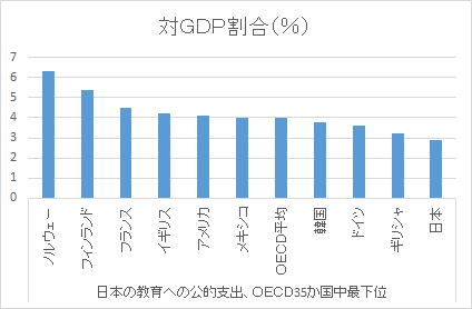 日本は、教育費の公的支出(対GDP比)が2019年もOECD(経済協力開発機構)加盟国中最下位だ。政府はもちろん、「教育費負担は家庭の自己責任」とする考えも根強く残っている。教育費の公的支出をOECD加盟国平均水準に引き上げていくことは、中央教育審議会でさえ目標としている。7兆円規模の予算で実現できる。