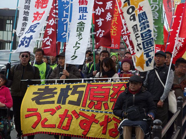 原発うごかすな!実行委員会@関西・福井が呼びかけ、11月23日福井県・関西電力高浜原発を起点に大阪市の関電本店まで約200`を「老朽原発うごかすな!」「関電の役員と再稼働に抗議」と訴えてつないだリレーデモ。ゴールの12月8日には、関電本店を1000人超で包囲する大集会を開いた。(詳報次号)
