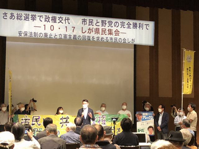 10月17日、大津市内で「さあ総選挙で政権交代を 市民と野党の完全勝利で しが県民集会」が開催された。「安保法制の廃止と立憲主義の回復を求める市民の会しが」が主催し、選挙前最初で最後の決起集会として参加者は200人を超えた。県内4野党(立憲、国民、共産、社民)代表と滋賀1区・斎藤アレックス(国民)、2区・田島一成(立憲)、3区・佐藤耕平(共産)、4区・徳永久志(立憲)が出席。全区の市民と野党の統一予定候補が勢ぞろいし、文字通り市民と野党が一体となって総選挙に勝利する陣形が整った。