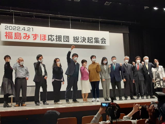 福島みずほ参院議員を再び国会に送り込もうと4月21日、都内で応援団総決起集会が開かれた。