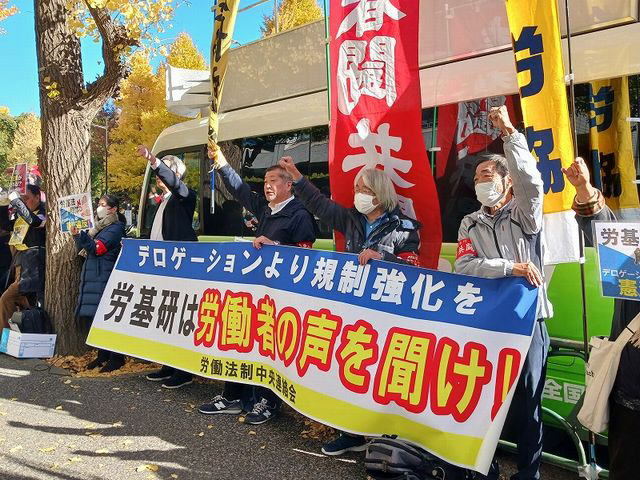 報告書案を議論する労基研に向け「労基法の解体を許さない」「労働時間規制を強化せよ」と声をぶつける(12月10日、厚生労働省前)