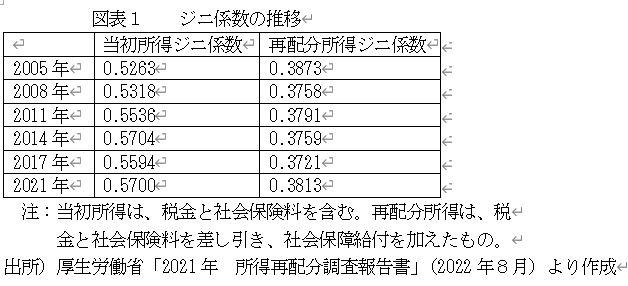図表1では、最近のどの年も当初所得ジニ係数は是正が必要な0・5を超え増加傾向にあること、再配分所得ジニ係数が比較的横ばいなので一定の社会保障給付の効果を見てとれることだ。とはいえ、再配分所得ジニ係数でもOECD(経済協力開発機構38か国)平均0・314より高く、日本は格差の大きい国だ。