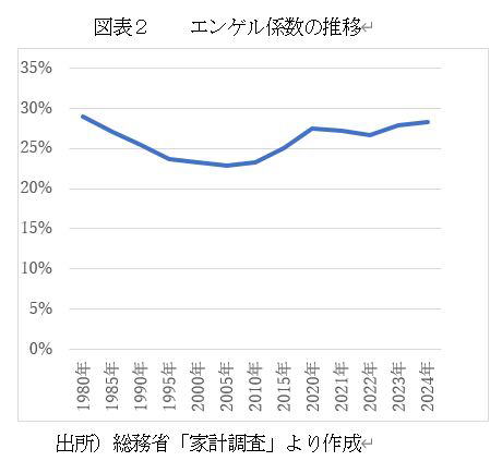 高齢化による収入減、非正規雇用の増加による所得低迷、食料費の急上昇が進行し、エンゲル係数の上昇傾向が強まることは間違いない。所得が伸びない中で、コメ価格をはじめ食料費の上昇は際立っており、その比重が大きくなるからだ。