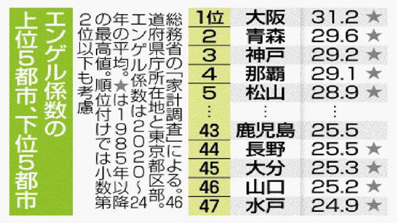 もう一つの指標にエンゲル係数がある。エンゲル係数は、家計の消費支出に占める食料費の割合を示す。所得が低ければエンゲル係数が高くなるので、そこから生活の実態と貧困の状態が見えてくる。
