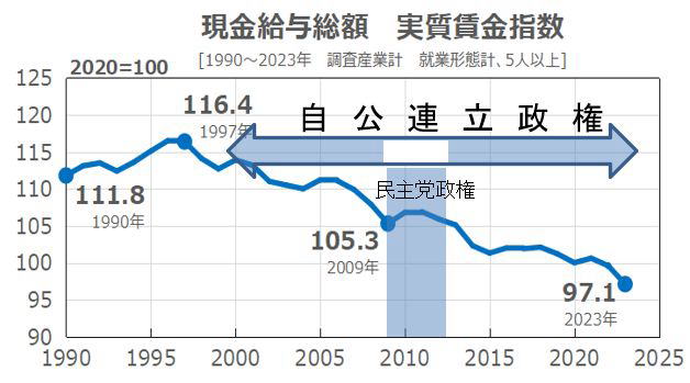 だが「裏金」問題は政治不信の象徴的な表れに過ぎない。自公政権が続いた4半世紀は「失われた30年」に重なる。経済成長は横ばい、労働者の賃金は減り続けたが、大企業の内部留保は拡大を続けた。つまり、経済は停滞しても、労働者の賃金を減らし続けることで大企業の利益が拡大する政治が行われてきたのだ。