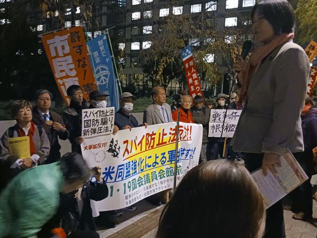 「高市首相による『台湾有事』発言を絶対に許さず、撤回をかちとりましょう」。11月19日の総がかり国会議員会館前行動は、司会を務める菱山南帆子さんの力強い言葉で始まった。