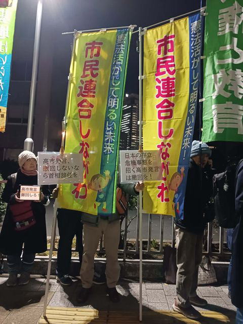 12月4日、首相官邸前で「高市発言撤回!日中戦争を煽るな!」緊急行動が11月25日に続いて行われ、300人が参加した。