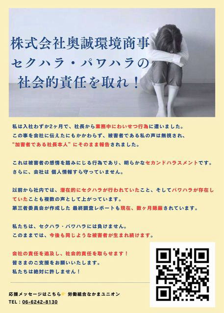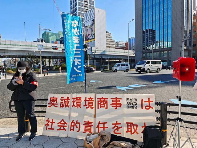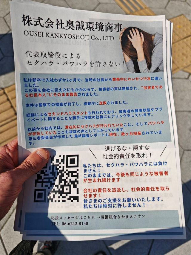 12月2日、大阪市西区の四ツ橋駅前にある渇恊ス(おうせい)環境商事・本社前に、同社で働く20代と30代の女性2名の怒りの声が響き渡った。2人は労働組合なかまユニオンの組合員。社長によるハラスメントに声を上げて告発した当事者だ。