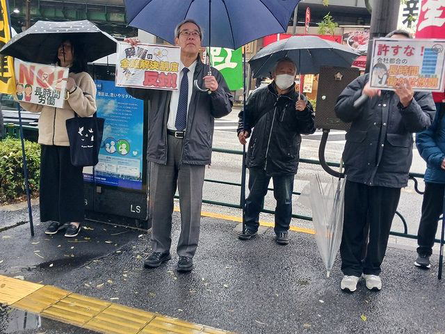 参加各労組から「時間外労働の上限は年間960時間。それ以上働かなければならないのは、賃金が安すぎるからで、首相ならそこを改善するのが当たり前ではないか」(全労協労働法制プロジェクトチーム・柚木康子さん)などの発言が続き、「長時間労働をなくせ」「1日7時間労働を法制化しろ」「過労死をなくせ」「解雇の金銭解決制度反対」とコールを重ねた。