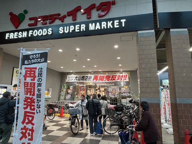 タワマン建設による立ち退き対象のスーパー「コモディイイダ大山店」入口には、「再開発反対」の大きなバナーが掲げてある。 短編の中で、同社社長の飯田武男さんは「最高裁まで闘ってもいい。行政代執行をするなら、壊されるまで商売をやる」と徹底的に闘う覚悟を述べた。昨年10月5日の、再開発反対を訴える6回目のデモ行進には230人が集結した。