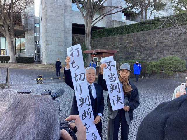 15分後、最高裁正門前に姿を見せた大口昭彦弁護団長と柳原敏夫弁護士の手から「不当判決」「打ち切り判断を免罪」の旗が垂れ下がる。大口弁護士は「当方の敗訴。腹立たしい最低裁判所の判断だ」と糾弾する一方、「三浦判事が情理を尽くした意見を出してくださった」と付け加えた。